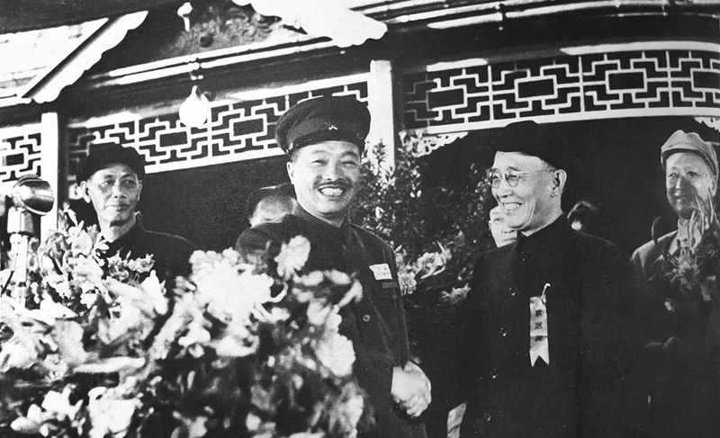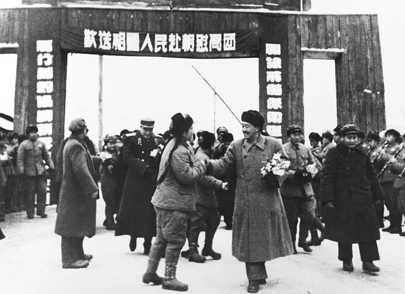 1953年10月,以賀龍為總團長的中國人民第三屆赴朝慰問團赴朝鮮前線慰問。圖為郭沫若等前往北京站送行