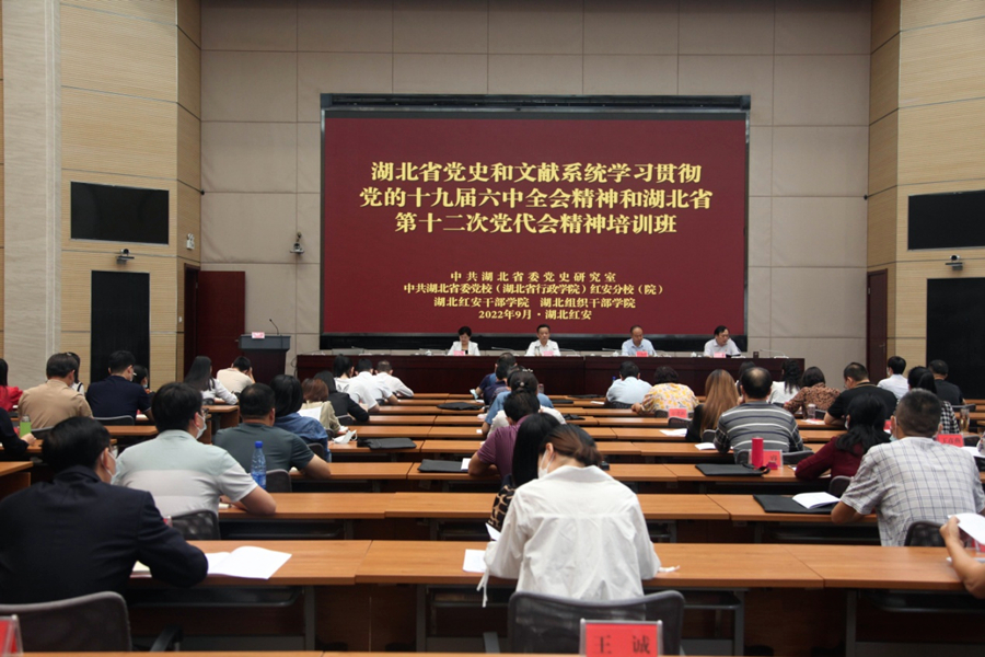為深入學(xué)習(xí)貫徹黨的十九屆六中全會精神和湖北省第十二次黨代會精神,推動學(xué)好用好全省市廳級主要領(lǐng)導(dǎo)干部專題培訓(xùn)班輔導(dǎo)內(nèi)容,促進(jìn)全省黨史和文獻(xiàn)事業(yè)高質(zhì)量發(fā)展,喜迎黨的二十大勝利召開,9月21日至25日,省委黨史研究室在湖北紅安干部學(xué)院舉辦“湖北省黨史和文獻(xiàn)系統(tǒng)學(xué)習(xí)貫徹黨的十九屆六中全會精神和湖北省第十二次黨代會精神培訓(xùn)班”。室主任何光耀出席開班式并作首場輔導(dǎo)報告,副主任王洲洋主持培訓(xùn)活動并作開班動員講話和總結(jié)講話,湖北紅安干部學(xué)院院長王曉琴出席開班式并致辭。來自省、市(州)、縣(市、區(qū))黨史和文獻(xiàn)系統(tǒng)共90名學(xué)員參加培訓(xùn)班學(xué)習(xí)。