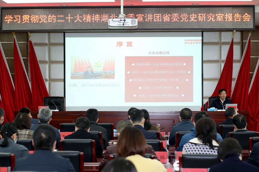 11月22日,學(xué)習(xí)貫徹黨的二十大精神湖北省委宣講團(tuán)在省委黨史研究室舉行宣講報告會。省委宣講團(tuán)成員、省委黨校(省行政學(xué)院)副校(院)長湯紅兵以《全面建設(shè)社會主義現(xiàn)代化國家的政治宣言和行動綱領(lǐng)》為題作宣講報告。室主任何光耀主持會議,室領(lǐng)導(dǎo)班子成員、廳級干部和全室黨員干部職工參加會議。