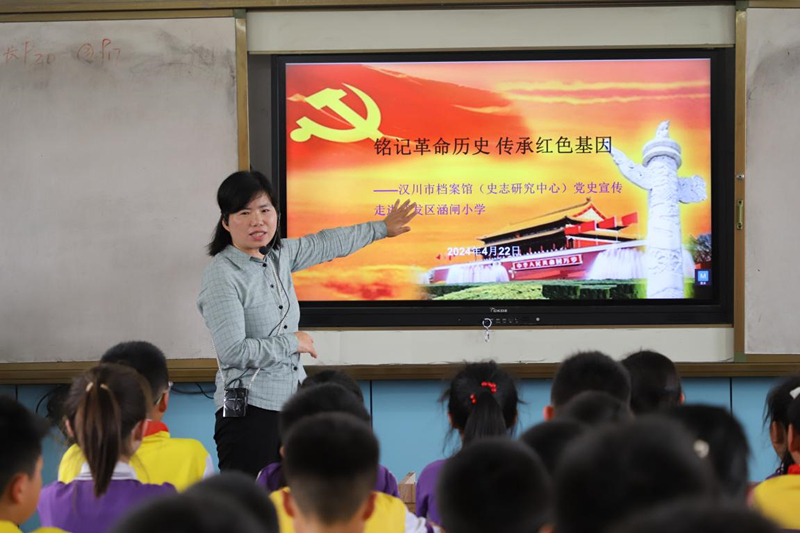 “廟頭鎮(zhèn)平章小學(xué)于1926年由革命先烈王平章親手創(chuàng)辦,這里曾經(jīng)是漢川革命的搖籃……”4月22日,在漢川市開發(fā)區(qū)涵閘小學(xué),市史志研究中心副科級干部劉愛萍以漢川這片富有底蘊的土地上發(fā)生的革命歷史及涌現(xiàn)的紅色名人為引線,帶領(lǐng)同學(xué)們感悟中國共產(chǎn)黨的成長發(fā)展歷程。