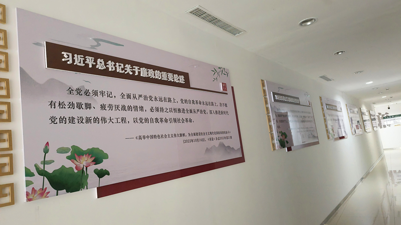 走進(jìn)漢川市史志研究中心辦公區(qū),煥然一新的廉政文化長(zhǎng)廊格外引人注目�!叭鎻膰�(yán)治黨永遠(yuǎn)在路上,黨的自我革命永遠(yuǎn)在路上”“各級(jí)領(lǐng)導(dǎo)干部特別是‘一把手’要做嚴(yán)守紀(jì)律規(guī)矩的表率”“巴豆雖小壞腸胃,酒杯不深淹死人”……中央、省、市各級(jí)主要領(lǐng)導(dǎo)關(guān)于廉政建設(shè)的重要講話,一則則引人深思的廉政故事,六條涵蓋工作與生活全方位的紀(jì)律規(guī)定,以及令人眼前一亮的廉潔公益廣告,搭配著一簇簇出淤泥而不染的蓮花圖,共同營(yíng)造出清新濃郁的廉潔文化氛圍,令人流連忘返。