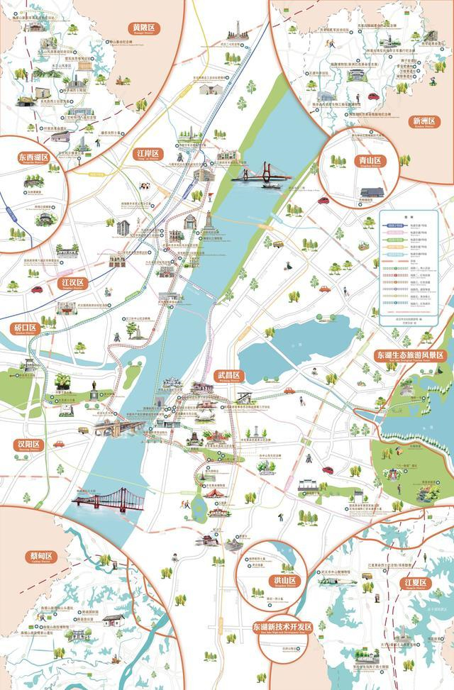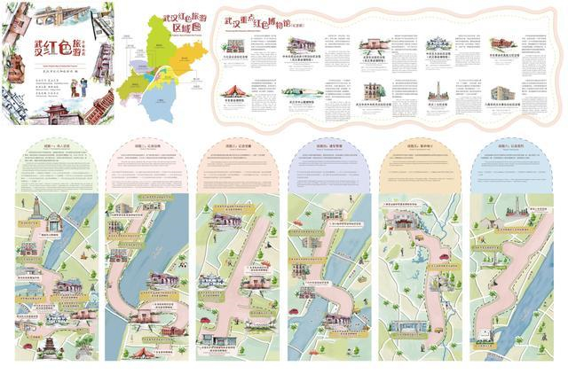 為慶祝中國共產(chǎn)黨建黨100周年,武漢市文化和旅游局圍繞“英雄城市 紅色傳承”主題,整合全市近百處重要紅色旅游資源設計并完成了《武漢紅色旅游手繪地圖》。該地圖涵蓋了辛亥革命、第一次國內(nèi)革命戰(zhàn)爭、第二次國內(nèi)革命戰(zhàn)爭時期、抗日戰(zhàn)爭時期以及新中國建立后等多個時間段在武漢所發(fā)生或遺留的紅色革命歷史遺址遺跡等紀念設施,地圖共分三大版塊,主版塊是武漢市域紅色資源手繪平面地圖,較為準確反映了八十多處重要紅色旅游景點。次板塊為新編六條武漢紅色旅游經(jīng)典線路,分為“偉人足跡”“紅色經(jīng)典”“紅色寶藏”“建軍策源”“革命烽火”“紅色英烈”六條線路,將重要紅色旅游場館按照主題進行推介。第三板塊為重點紅色革命博物館,詳細介紹了武漢市十個重點紅色革命博物館(紀念館)。