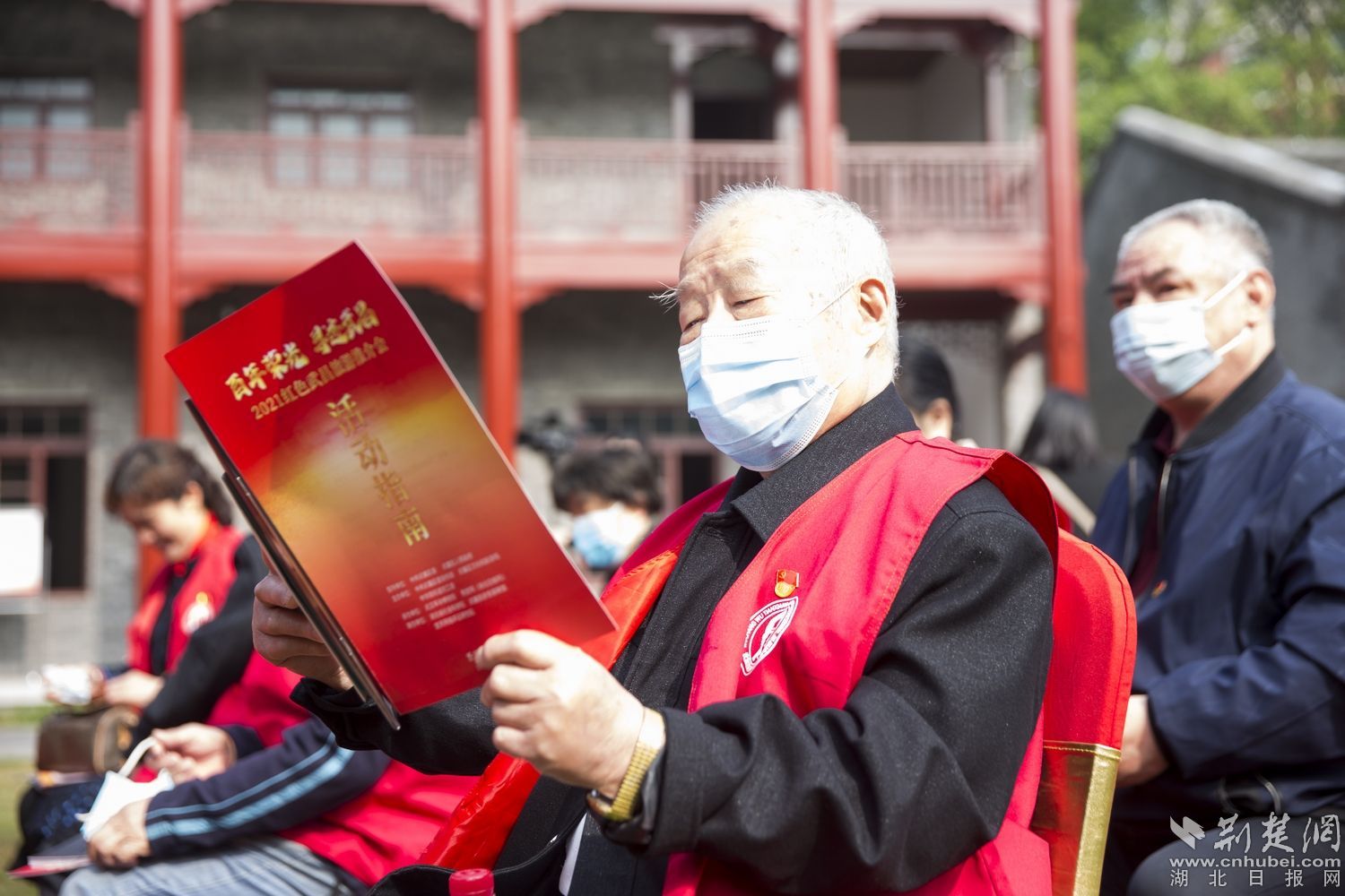 參加推介會(huì)的“紅巷爺爺”正在閱讀紅色旅游線路資料�!凹t巷爺爺”是都府堤社區(qū)一支熱心社區(qū)事務(wù)、樂于傳播紅色文化的退休老黨員團(tuán)隊(duì),他們常穿紅馬甲,走街串巷,服務(wù)社區(qū)居民,宣講紅色故事。