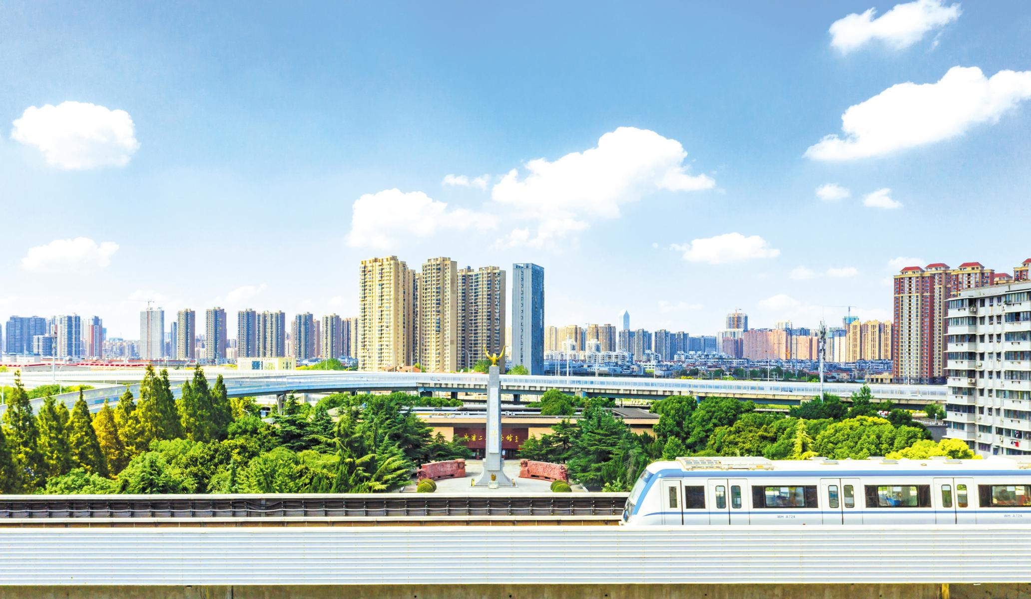 一列輕軌列車從武漢二七烈士紀念碑前經(jīng)過。二七烈士紀念碑是為紀念1923年在“二七大罷工”中犧牲的烈士而立。