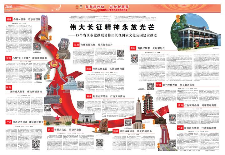 2024年是紅軍長征出發(fā)90周年,為深入貫徹落實(shí)習(xí)近平總書記相關(guān)重要指示批示精神,全國兩會期間,貴州日報(bào)聯(lián)合福建日報(bào)、江西日報(bào)、河南日報(bào)、湖北日報(bào)、湖南日報(bào)、廣西日報(bào)、重慶日報(bào)、四川日報(bào)、陜西日報(bào)、甘肅日報(bào)、青海日報(bào)、寧夏日報(bào),聚焦長征國家文化公園建設(shè)情況,生動呈現(xiàn)各地如何以長征國家文化公園建設(shè)為載體,展現(xiàn)長征文化、弘揚(yáng)長征精神、賡續(xù)紅色血脈。