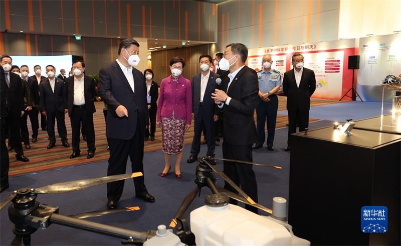 6月30日下午,國(guó)家主席習(xí)近平在香港特別行政區(qū)行政長(zhǎng)官林鄭月娥陪同下,來(lái)到香港科學(xué)園考察。這是習(xí)近平在科學(xué)園展廳聽(tīng)取香港創(chuàng)新科技發(fā)展、深港創(chuàng)新科技發(fā)展互動(dòng)、香港科學(xué)園發(fā)展等情況介紹,觀看香港代表性創(chuàng)科企業(yè)展示。新華社記者 丁海濤 攝
