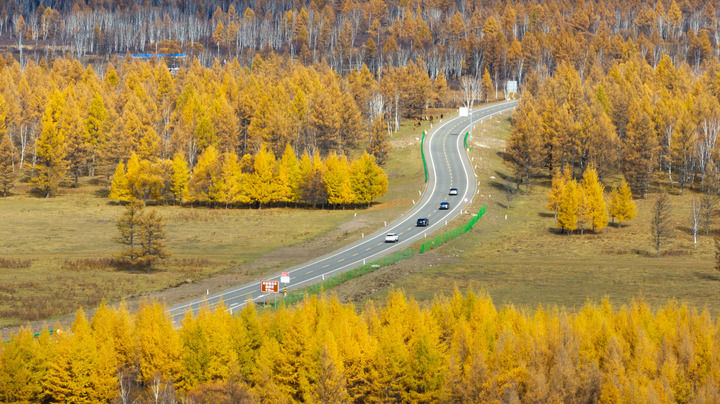 2025年9月29日,游客在內蒙古阿爾山國家森林公園駕車游玩(無人機照片)。新華社記者 貝赫 攝