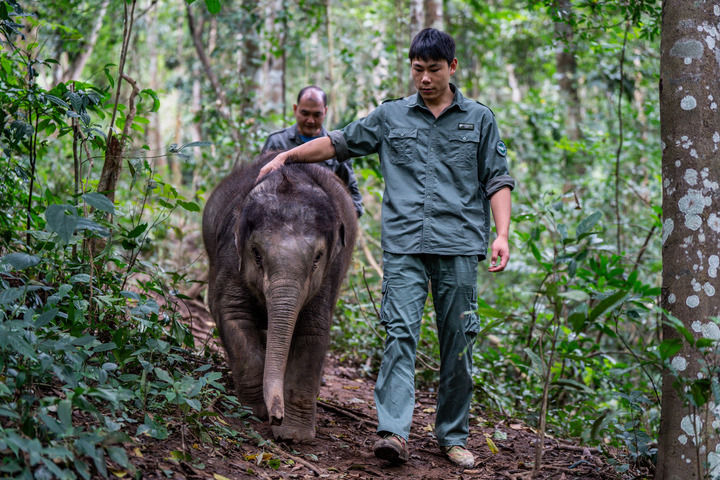 2024年12月8日,西雙版納亞洲象救護與繁育中心工作人員莫詩宇(右)、陳繼銘帶小象到野外開展訓練。新華社記者 胡超 攝