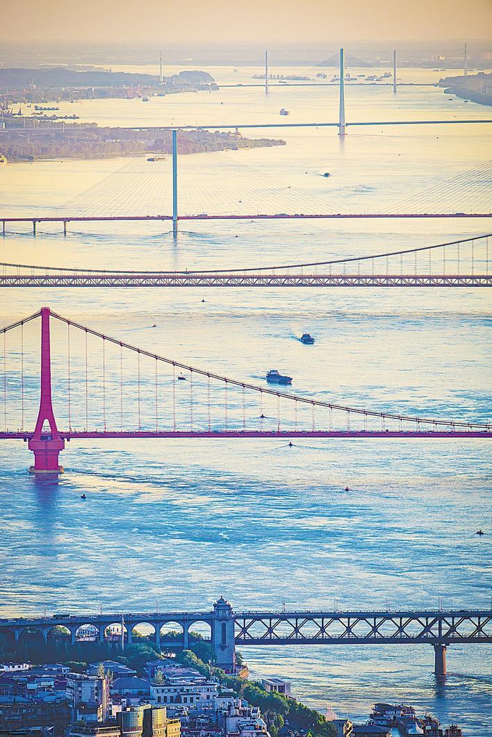 武漢晴空萬里,能見度極高,在高處遠(yuǎn)眺,一眼可以看到六座長(zhǎng)江大橋。 (湖北日?qǐng)?bào)全媒記者 任勇 攝)