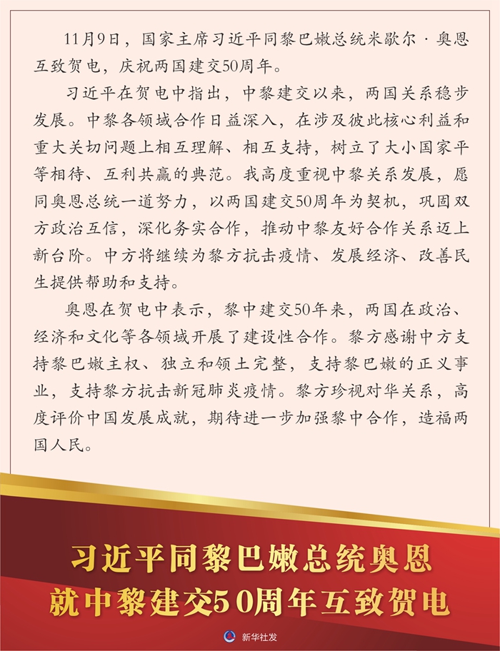 習(xí)近平在賀電中指出,中黎建交以來,兩國關(guān)系穩(wěn)步發(fā)展。中黎各領(lǐng)域合作日益深入,在涉及彼此核心利益和重大關(guān)切問題上相互理解、相互支持,樹立了大小國家平等相待、互利共贏的典范。我高度重視中黎關(guān)系發(fā)展,愿同奧恩總統(tǒng)一道努力,以兩國建交50周年為契機(jī),鞏固雙方政治互信,深化務(wù)實(shí)合作,推動中黎友好合作關(guān)系邁上新臺階。中方將繼續(xù)為黎方抗擊疫情、發(fā)展經(jīng)濟(jì)、改善民生提供幫助和支持。
