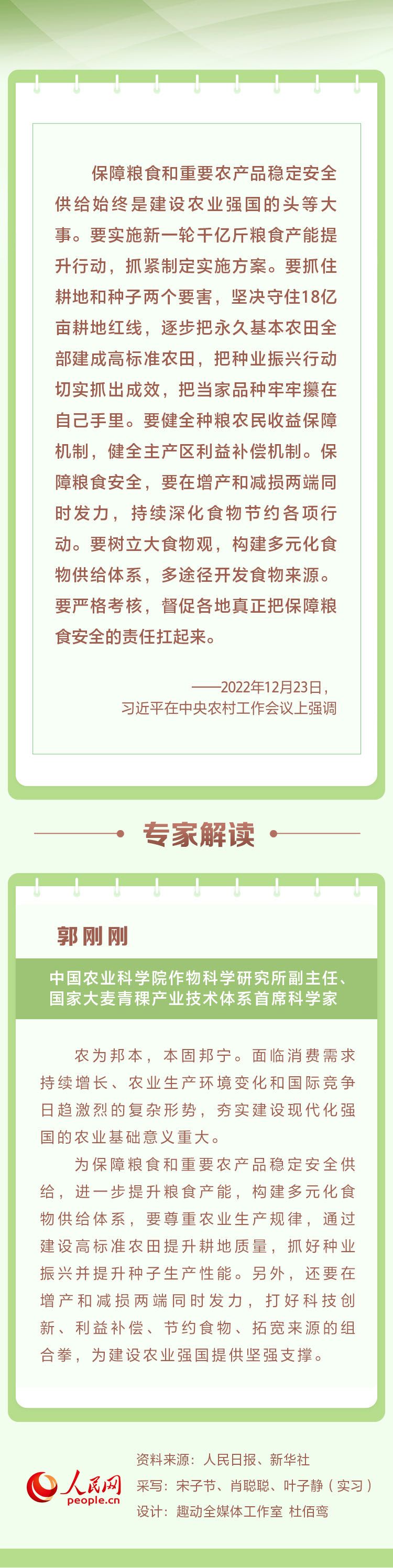 12月23日至24日,中央農(nóng)村工作會議在北京舉行。中共中央總書記、國家主席、中央軍委主席習(xí)近平出席會議并發(fā)表重要講話。人民網(wǎng)帶您重溫講話要點并邀請專家進行解讀。本期聚焦“保障糧食和重要農(nóng)產(chǎn)品穩(wěn)定安全供給始終是建設(shè)農(nóng)業(yè)強國的頭等大事”。