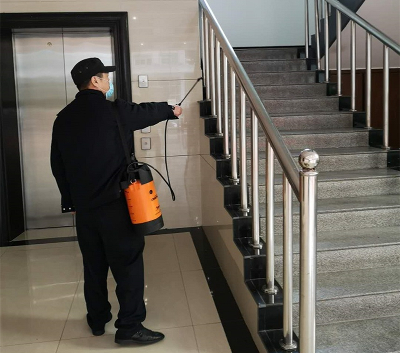 機關(guān)工作人員對辦公樓進行洗消消毒
