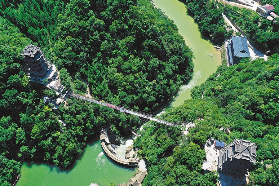踏入堯帝神峽,清風(fēng)夾雜著水霧撲面而來(lái);沿著步道探秘峽谷,“果凍湖”澄澈碧藍(lán),宛如人間仙境;置身堯帝天橋,168米的高空落差,讓游客體驗(yàn)“凌空天際踏云行,綠水青山腳下走”;走進(jìn)充滿神秘色彩的老龍宮,光影在溶洞間交錯(cuò),勾勒出一派奇幻景象;穿梭于三界洞天,曲徑通幽之處體驗(yàn)別樣的探險(xiǎn)之旅。