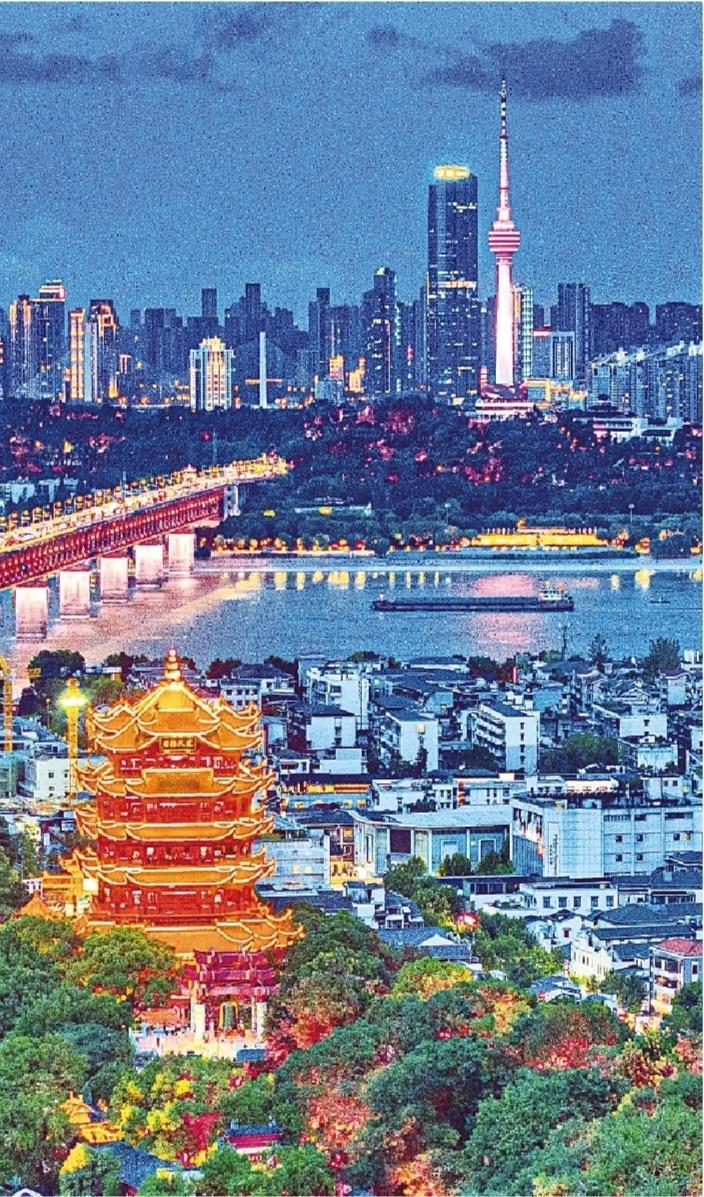 7月21日傍晚,武漢市黃鶴樓景區(qū)流光溢彩,同長江對岸現(xiàn)代化建筑群交相輝映,見證盛世繁華。(湖北日報(bào)全媒記者 劉曙松 攝)