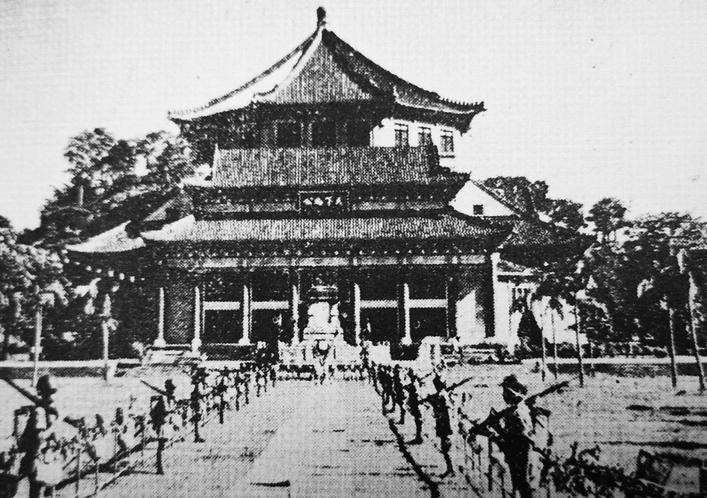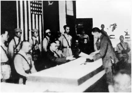 1945年9月9日,侵華日軍投降簽字儀式在這里舉行。當(dāng)日9時(shí),侵華日軍總司令岡村寧次在降書上簽字蓋章,日本投降代表、侵華日軍參謀長小林淺三郎俯首躬身,向國民政府遞交降書。