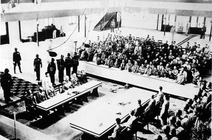 上午10時(shí)10分,日本投降代表根本博一行由太和門外下車,垂頭喪氣,步行入場。21名投降代表在萬眾怒目之下,雙手捧著自己佩戴過的戰(zhàn)刀,恭恭敬敬地放在受降桌上。