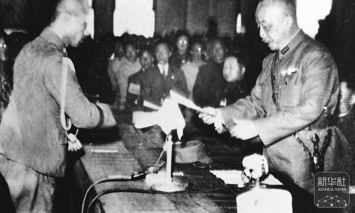 1945年9月9日9時(shí),南京中央陸軍軍官學(xué)校大禮堂,侵華日軍總司令岡村寧次在降書上簽字蓋章。